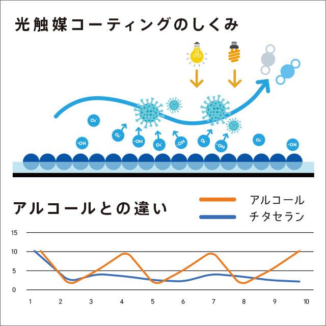光触媒コーティングは一回の施工で長期間除菌抗菌の効力が維持するのが分かります。アルコールは定期的に何度も作業が必要になります。